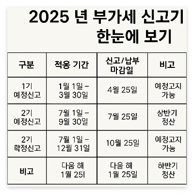 2025년 부가세 신고기간은 확정신고(7·1월)와 예정신고(4·10월)까지 총 4회입니다.