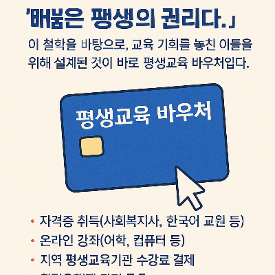 이 철학을 바탕으로, 교육 기회를 놓친 이들을 위해 설계된 것이 바로 평생교육 바우처입니다.